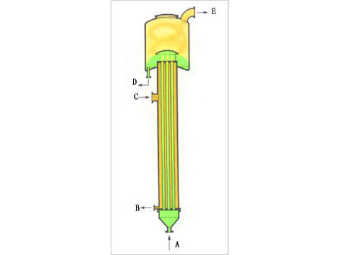 升膜式蒸發(fā)器又稱爬升膜蒸發(fā)器,它依據(jù)虹吸泵原理操作,根據(jù)在沸騰過程中產生的蒸汽氣泡的升力,液體和蒸汽并流向上流動,同時,產生的蒸汽量增加,從而,在管壁上產生流動的膜,即液體向上“爬”。并流向上運動有肋于在液體中產生高度的湍流。
